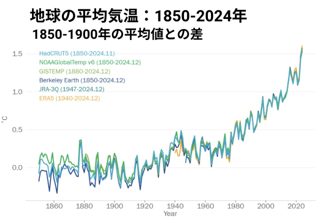 時折、寒い日があったとしても、地球の平均気温は少なくとも過去1万年のどの時期よりも急速に上昇を続けています。最近の10年(2015-2024年)は観測史上、最も暑い期間となっています(NASA、WMO)。