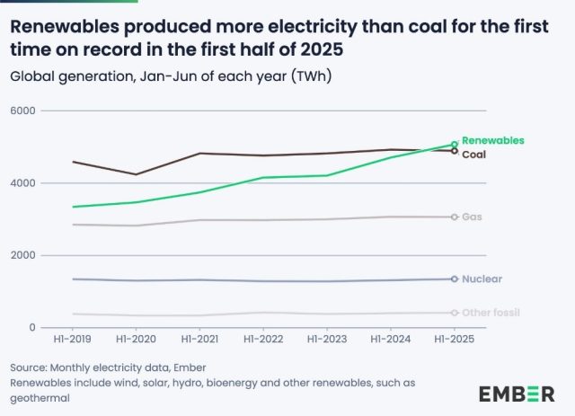 Emberによると、2025年上半期には、再生可能エネルギーによる世界の発電量が34.3%を占め、初めて石炭の発電量(33.1%)を上回りました。