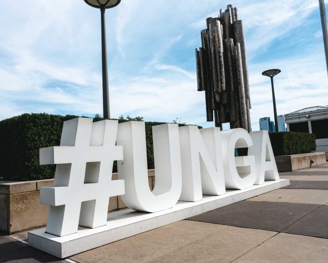 (左)国連本部に設置されたハッシュタグUNGA のイメージ